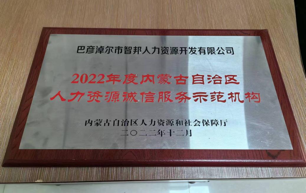 巴彦淖尔市人社局为“2022年度内蒙古自治区人力资源诚信服务示范机构”