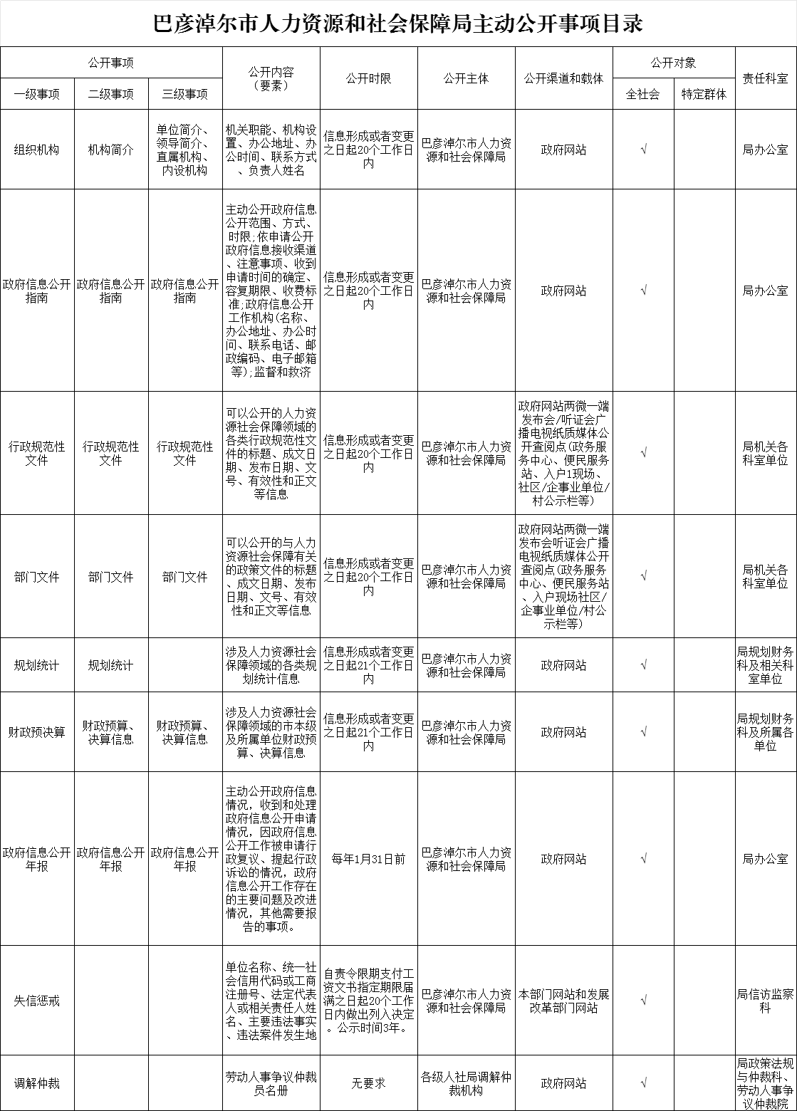 巴彦淖尔市人力资源和社会保障局主动公开事项目录